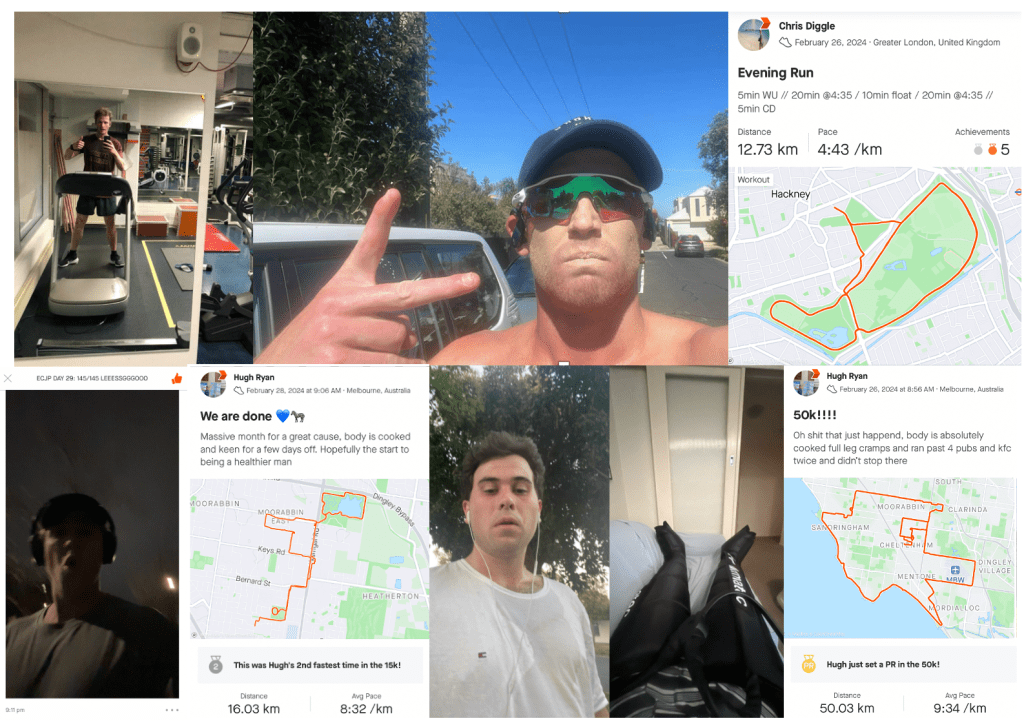 Most kilometres run: Ben Pryor – 202km. Longest run: Hugh Ryan – 50km; Fastest 5km: Ben Pryor – 19min 42sec.